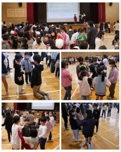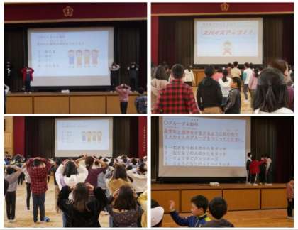 今日の児童集会は、簡単にできるシナプソロジーをたて割班で取り組みました。