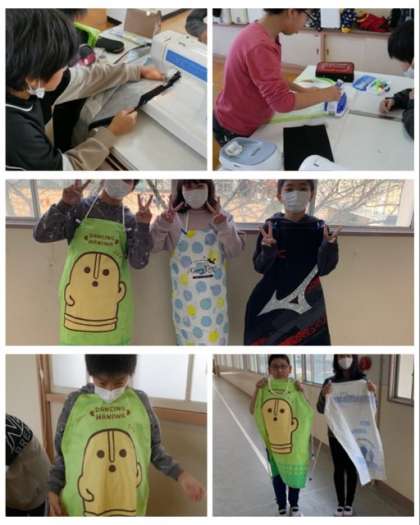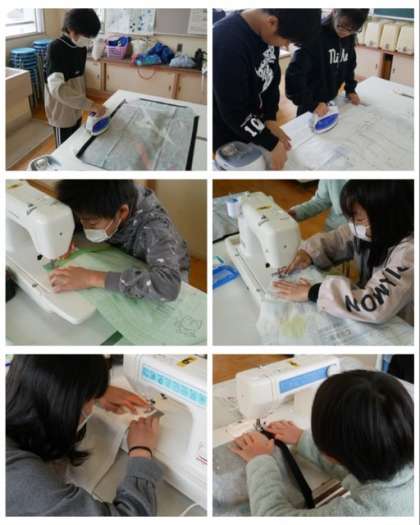 5年生は、家庭科の学習で初めてミシンを使ってエプロン作りに挑戦しました。