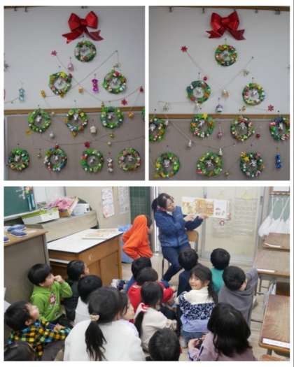 また、教室の掲示板には、先日作ったクリスマスリースを並べて形どった、大きな二本のクリスマスツリーを飾っています。