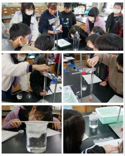 5年生は、理科の「ものの溶け方」の学習で、食塩やミョウバンが水に溶ける様子を観察しました。