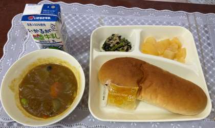 ★ミートボールと野菜のカレー煮★ツナとこまつなのソテー★白桃(カット)缶