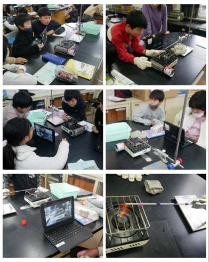 4年生は、理科の学習で金属を熱した時の温まり方を示温テープを使って調べました。