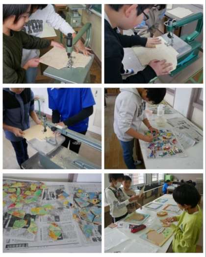 5年生は、図画工作科で電動糸鋸のこを使ってパズルを作っていました。電動糸のこの操作にも慣れて、次々にパズルのピースを作り上げていきました。あとは、ニスを塗ったら、完成です。