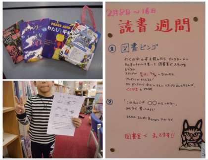 今回の読書週間の目玉は、「図書ビンゴ」です。ビンゴができると、学校図書館司書さん手製の紙バッグがもらえます。