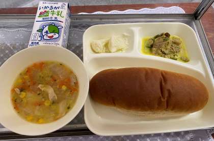 ★豚肉のカレー風味焼き ★はくさいとコーンのスープ ★カリフラワーのレモンドレッシング ★黒糖パン ★牛乳