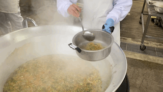 上の動画は、卵の入れる前のカツ丼から、卵アレルギーの児童用に除去食を取っているところです。調味料の量も工夫して、卵がなくてもおいしく食べられるよう工夫しています。