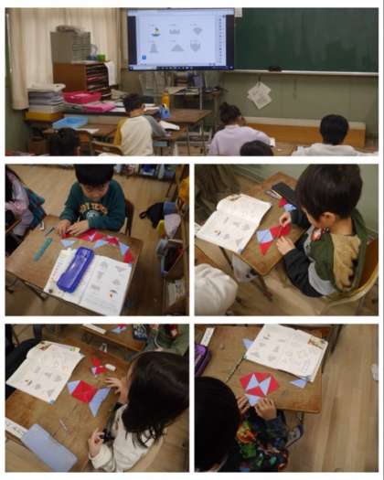 1年生は、算数科の学習で同じ大きさの三角形を組み合わせて、船やロケットの形作りをして、楽しみました。