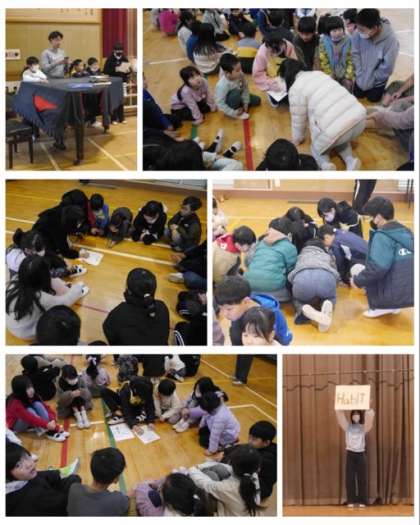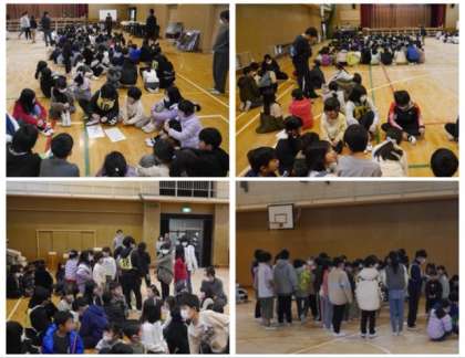 今回の児童集会は、縦割り班に分かれてイントロクイズをしました。問題は、全部で8問。どの班も、頭を寄せ合って答えを教え合って、楽しく盛り上がりました。全問正解した班は、その場で起立して、拍手をもらいました。