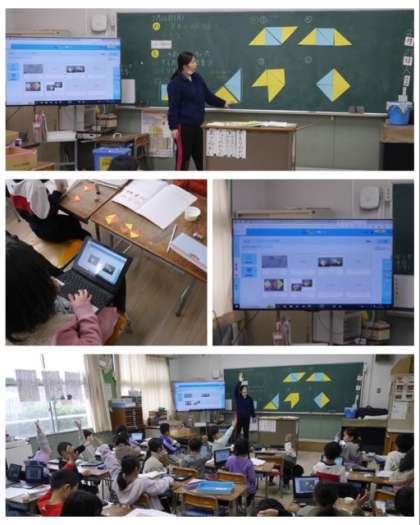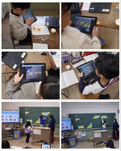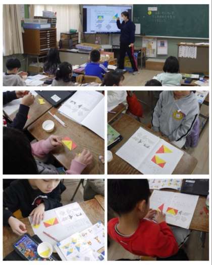 ?1年生は、算数科の学習で、4枚の三角形の色板を組み合わせて、指定されたいろいろな形を作って写真に撮ってデータとして残しました。