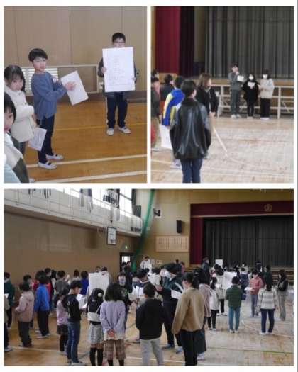 今日の児童集会は、明日の卒業生を祝う会に向けて在校生だけで、祝う会で歌う歌の練習や、プレゼント交換の手順を練習しました。