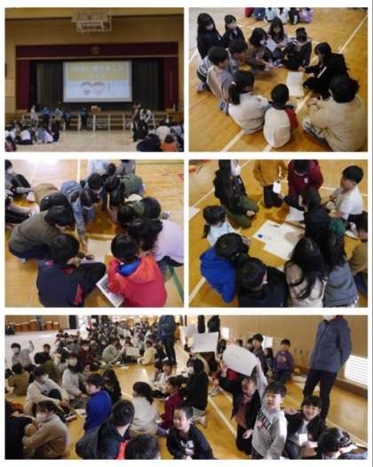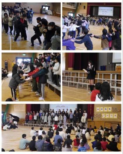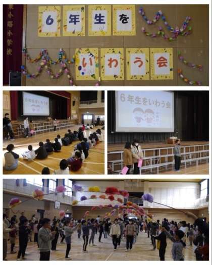 次に、「クイズ、6年生45人に聞きました」と「じゃんけん列車」のゲームをして楽しんだあと、6年生から各クラスにぞうきんを贈呈し、祝う会を開いてくれたお礼に歌のプレゼントをして、和やかな雰囲気で祝う会を終えました。