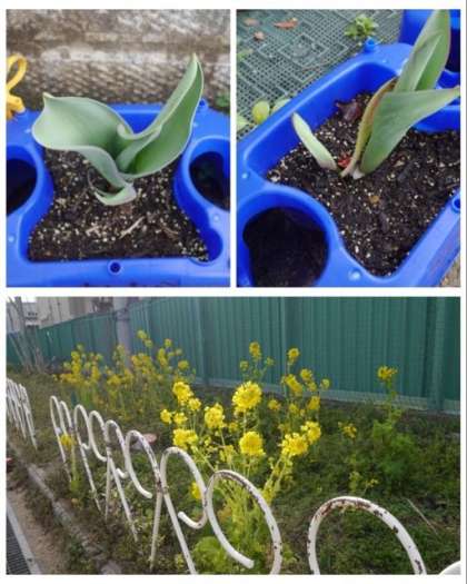 1年生が育てているチューリップは、ぐんぐん葉を伸ばし、学習園の菜の花は、きれいな花を咲かせています。春は間近です。