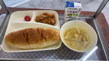 ★とうふのミートグラタン ★じゃがいもと野菜のスープ ★いちご ★おさつパン ★牛乳