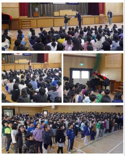 給食後に、体育館で令和5年度修了式を行いました。5年生代表の人に、学校長が修了証を手渡し、各学年の一年間の成長を讃えました。