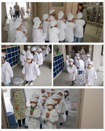 給食当番が給食室まで給食を取りに行き、重い食器もがんばって運びました。