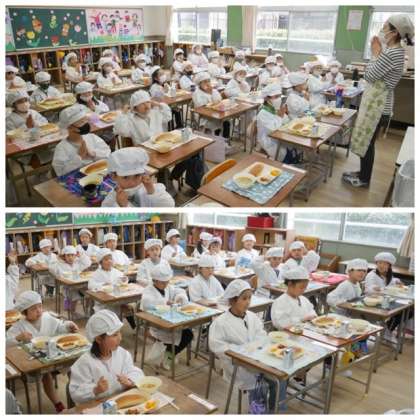 配膳が終わり、みんなで手を合わせて「いただきます」をし、給食をおいしくいただきました。