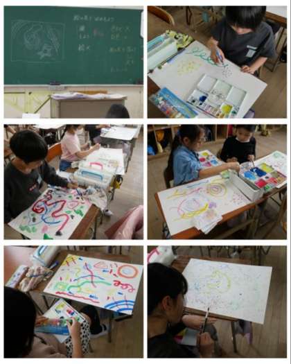 4年生は、図画工作科で「絵の具でゆめもよう」をテーマにして単色を組み合わせてデザインしました。