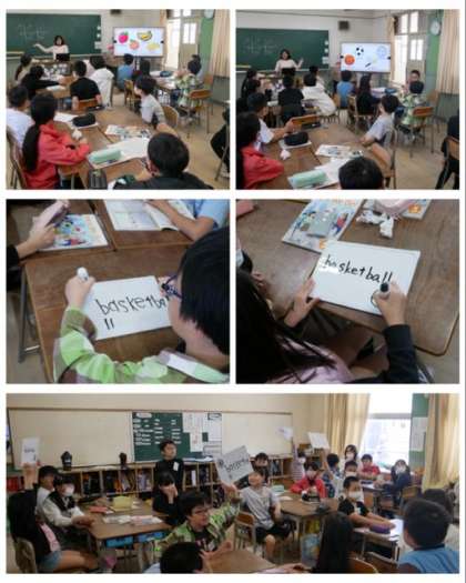 5年生は、担任の好きな果物やスポーツを選んで英語で答えるクイズ形式でC-NETと楽しく英語を学びました。