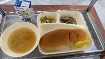★豚肉のガーリック焼き★スープ★ツナとキャベツのソテー★コッペパン★牛乳
