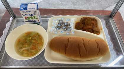 ★煮こみハンバーグ★野菜のスープ★ミニフィッシュ★黒糖パン★牛乳