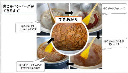 煮こみハンバーグは、しっかり炒めた玉ねぎとマッシュルームにケチャップで味をつけて、ハンバーグを入れてしっかり煮こんだ料理です。