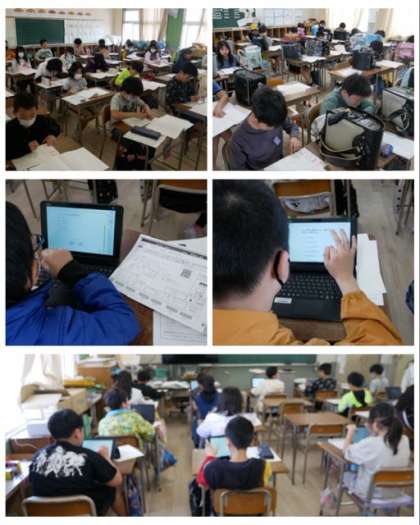 5年生は、大阪府が実施するすくすくウォッチの問題に取り組みました。調査の最後には、一人一台学習者用端末を使ってオンラインでアンケートに回答を入力しました。