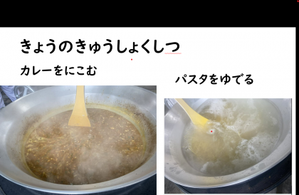 カレースープスパゲティは、カレー味のスープにスパゲティを入れます。スパゲティーはできる限り伸びないように湯で加減を調整して、スープの中に入れて作ります。提供までの時間も考えて湯で加減を調整しています。