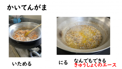 回転がまはいためたり煮たりすることのできる機械で、なんと110リットルも水が入ります。たくさんの量の料理を作る給食には欠かせない調理器具です。
