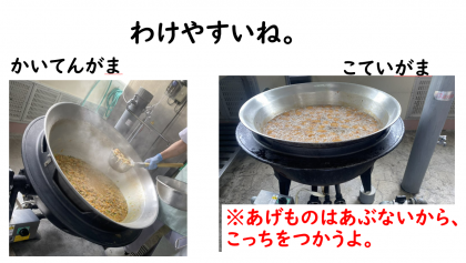 今月は、給食室で使う機械を紹介しています。昨日の固定がまに引き続き、給食調理のエース回転がまを紹介します。
