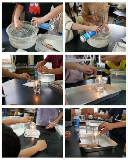 6年生は、理科の学習で、酸素・二酸化炭素・窒素を入れた集気びんの中にろうそくの火を入れて、どのような燃え方をするのか実験しました。