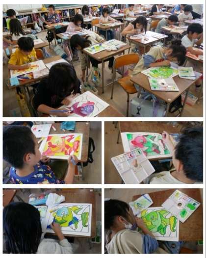 3年生は、図画工作科で魚の絵を隣同士の色をどのように組み合わせるのか工夫をしながら色を付けていきました。