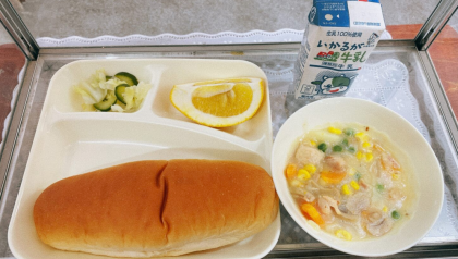 ★鶏肉とコーンのシチュー★キャベツときゅうりのサラダ★かわちばんかん★黒糖パン★牛乳