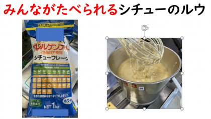 いつものホワイトルウと違って、市販のアレルギーフリーのルウを使って調理しています。また牛乳の入ったルウとは違った味わいがあり、子どもたちにも好評でした。