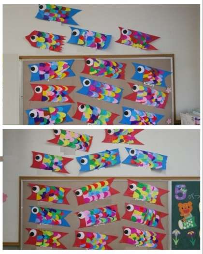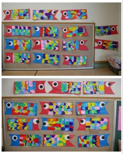 1年生の教室には、こいのぼりが楽しそうにたくさん泳いでいます。