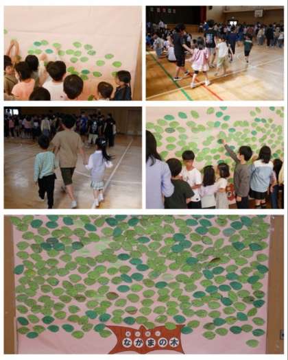 今日の児童集会は、なかま集会でした。友だちから言ってもらったうれしい言葉を書いた葉っぱを「なかまの木」に全員貼り付けていきました。