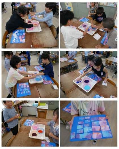 2年生は、色水で紙染めをしました。染めた紙を使って、さて、何ができるのでしょうか。お楽しみです。