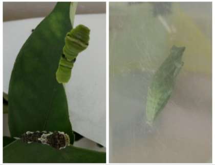 3年生の教室前の廊下では、只今あおむし飼育中です。ちょうど、アゲハチョウの幼虫の変化の段階がよくわかるので、思わず写真に収めました。しかも、さなぎもありました。