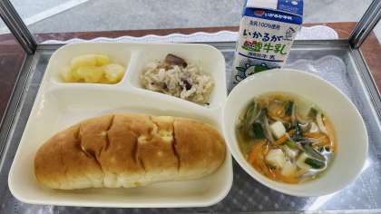 ★豚肉と金時豆の中華おこわ★中華スープ★パインアップル缶★おさつパン★牛乳