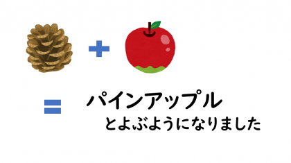パインアップルについてです。パイナップルということもありますが、どちらも同じ果物です。食品成分表には、パインアップルと掲載されています。今日はその名の由来について、紹介しました。