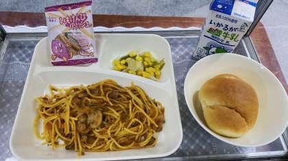 ★ミートソーススパゲティ★レタスとコーンのサラダ★いもけんぴフィッシュ★ミニコッペパン★牛乳