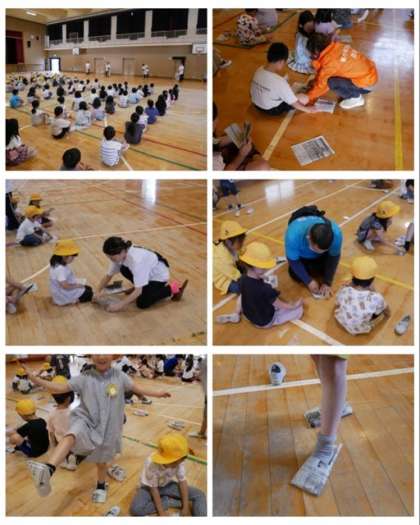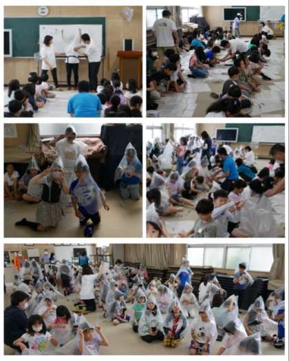 それから、地域の企業ボランティア団体BASE544の方から、低学年は、新聞紙で作るスリッパ、中学年は、ゴミ袋で作る雨ガッパ、高学年は、ライフラインが止まった時に備えて着火体験をしました。