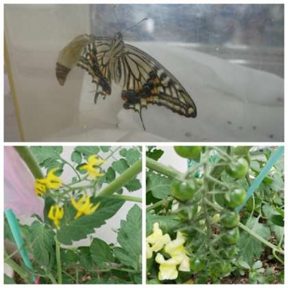 3年生が飼っていた青虫がアゲハチョウに変身しました!また、2年生が育てているミニトマトも、花が咲き、まだ緑ですがミニトマトの実が立派に育っています。