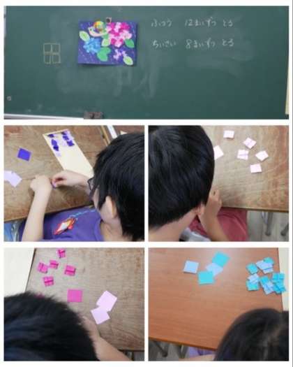 1年生は、図画工作科でアジサイを色紙を折って作っています。