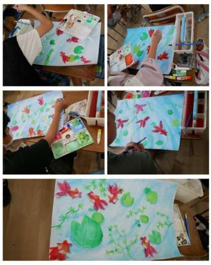 6年生は、図画工作科で涼し気に泳ぐ金魚を描きました。水草が浮いていて金魚鉢を上からのぞいているようです。