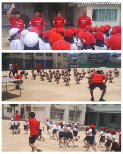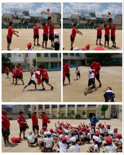 ウォーミングアップをしてから、チーム対抗のゲームやタックルなどを体験して、選手のみなさんと楽しい時間を過ごしました。