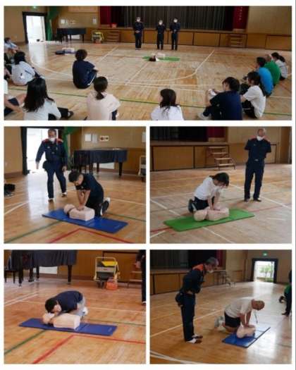 6月17日から始まるプール水泳に備えて、救急救命講習を生野消防署の方から受け、心肺蘇生やAEDの使い方について実習しました。