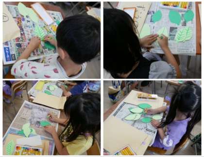 1年生は、図画工作科で、アジサイを作っています。今日は、アジサイの葉っぱを作りました。
