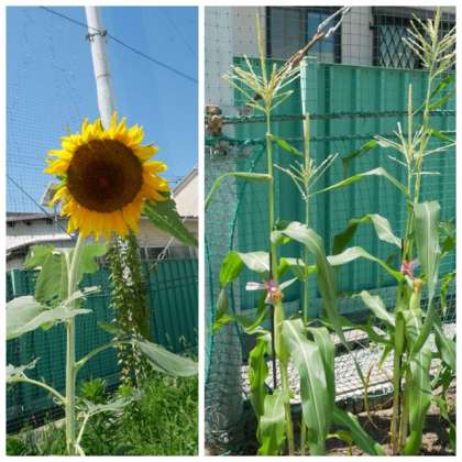 ひまわりが元気よく、太陽に向かって咲いてます。また、とうもろこしも、大きく成長しています。