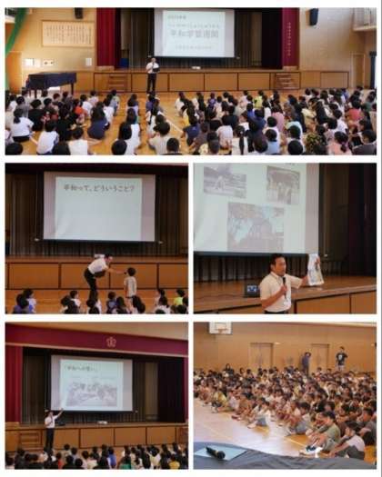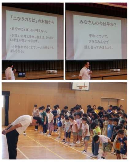 7月8日から1学期末まで、本校では「平和学習週間」として平和学習について取り組みます。まずは、学校長から、「平和ってどういうことかな」ということをテーマにして、全校児童に投げかけました。みんな真剣に考えて意見を堂々と発表しました。