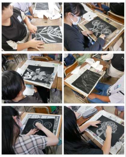 5年生は、図画工作科「消してかく」の作品で、顔を真っ黒にしながら、思い思いの花をモチーフに表していました。
